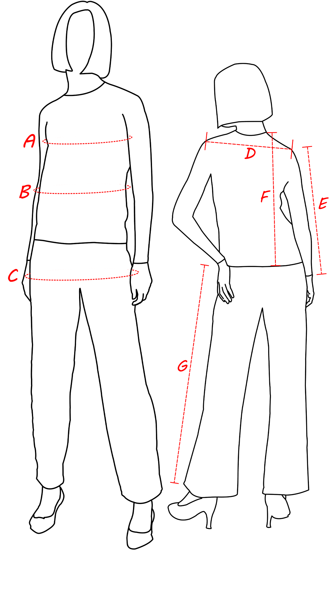 - Lembre-se de deixar a fita métrica sempre reta ao tirar medidas. Por exemplo: tome cuidado para que a fita métrica não fique frouxa nas suas costas ao tirar medidas de circunferência de busto e cintura;